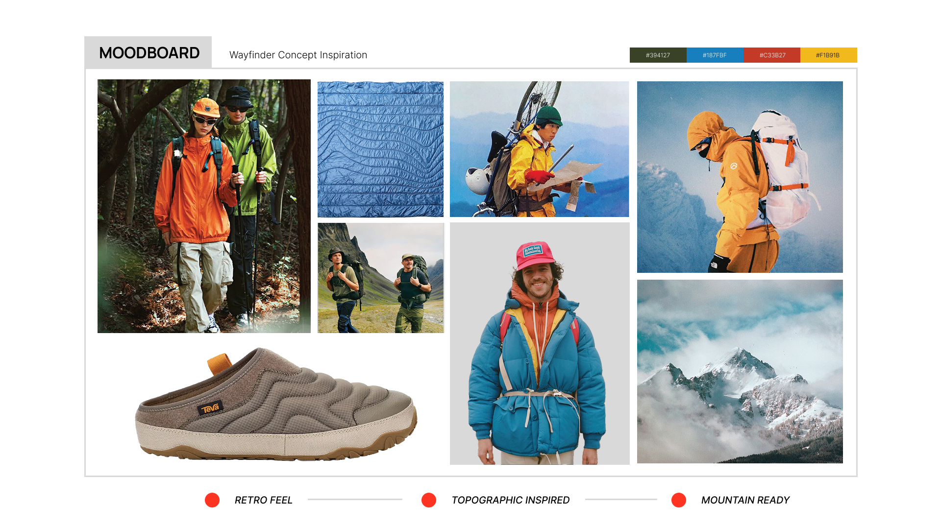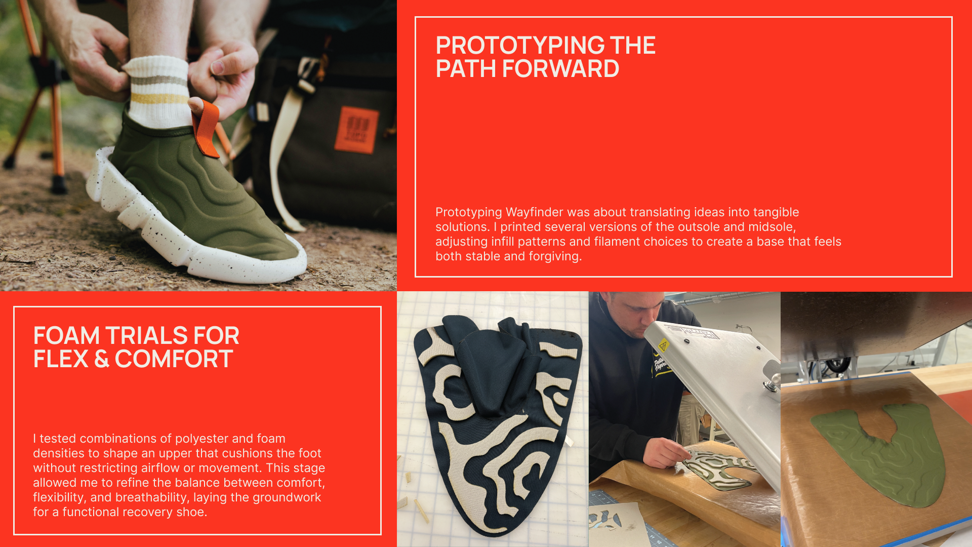 Mountaineers endure extreme terrain, long hours, and intense physical strain, leaving their feet tired, swollen, and vulnerable. After the climb, most footwear falls short in supporting recovery, often causing discomfort, restricted movement, and lingering hotspots that delay healing and performance. WayFinder is a solution to provide skilled climbers with the necessary compression, comfort, and traction that will allow them to be tackle any mountain.